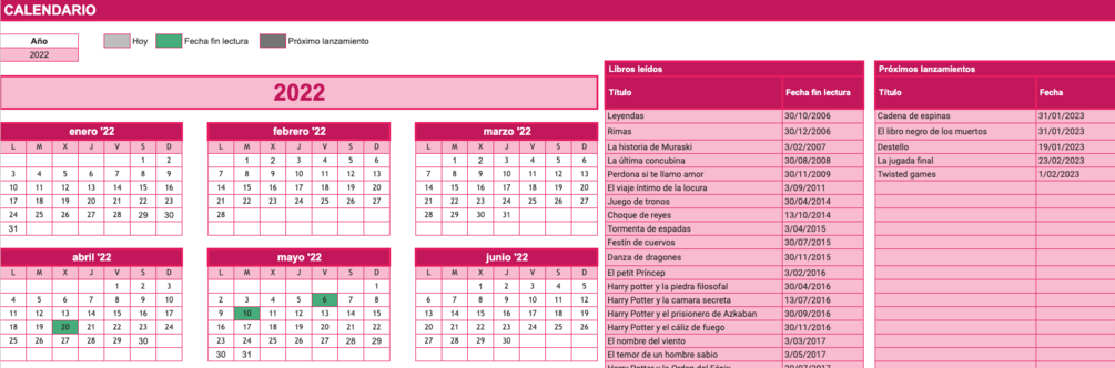 - Una estantería con los libros leídos, un calendario para marcar fechas importantes, un registro de tus sagas, retos de lectura...