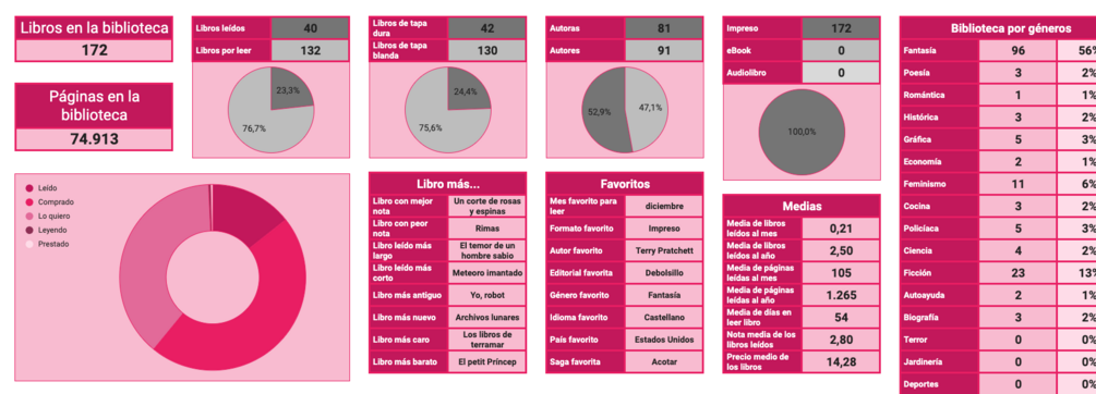 - Un resumen de todos los datos importantes de tu biblioteca (libros totales, libros leídos, biblioteca por géneros, evolución de tus hábitos de lectura...).